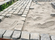 Заранее просыпав площадь места захоронения пескобетонной смесью начинаем строгими рядами укладывать брусчатку.